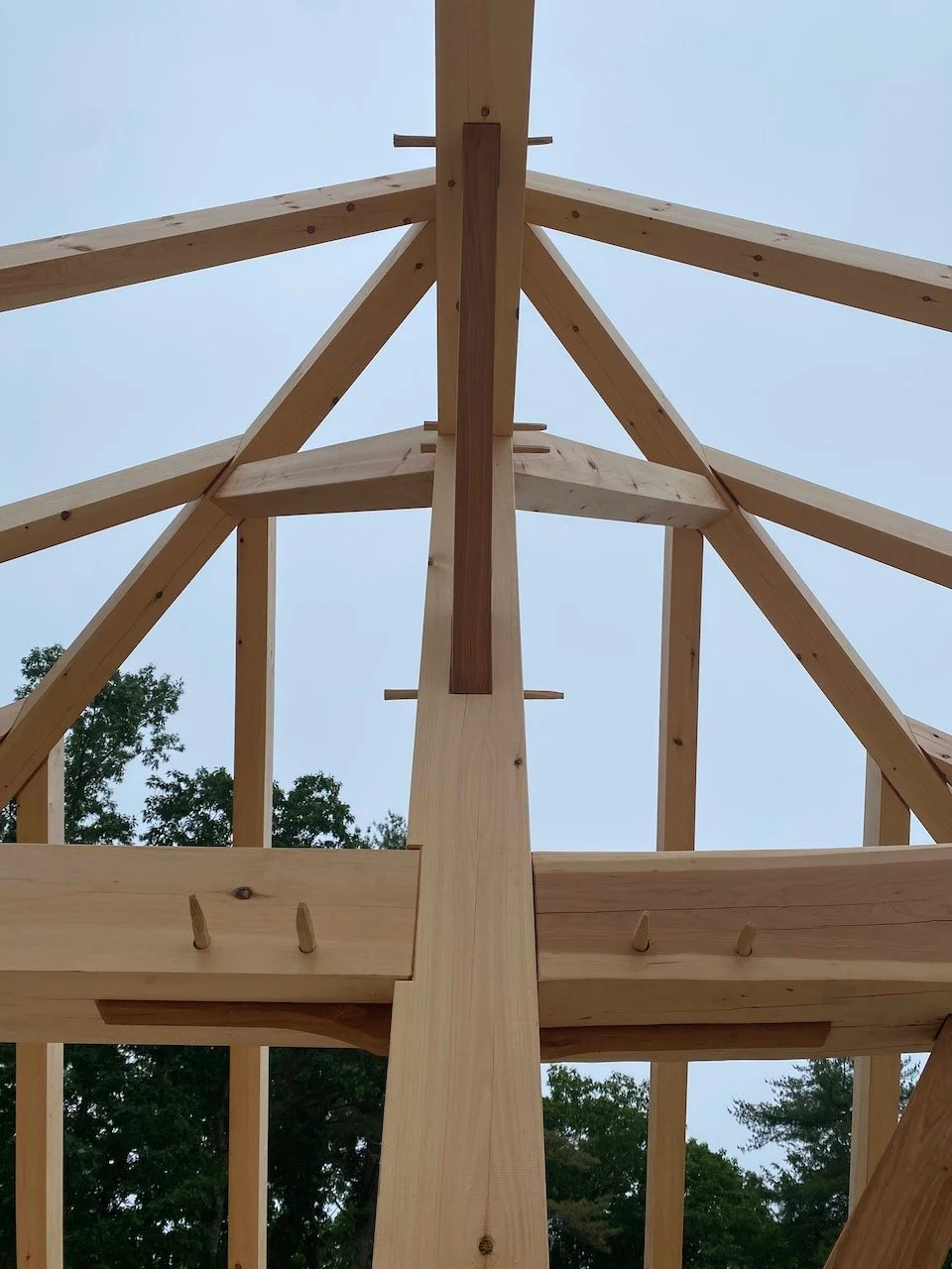 Another project from my time at Timberhomes Vermont. This sweet timber frame was a collaboration with Andrea Warchaizer of Springpoint Design, who designed the floor plan for this house along with the schematic timber frame design. We added curved cherry tie beams and braces, two small whimsical forked tree posts up high, and a big St Andrews Cross made with curved cherry slabs in the center of the building. This frame is an excellent example of a hip roof, AKA a four-sided pyramid.